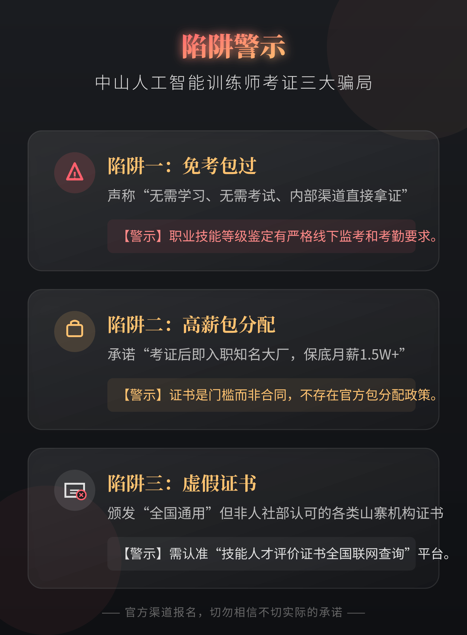“虚假证书”:请认准证书上的“职业技术品级证书”字样及人社部存案号。毫不会许诺“报名即签合同保底月薪”。让我能专注于复习!